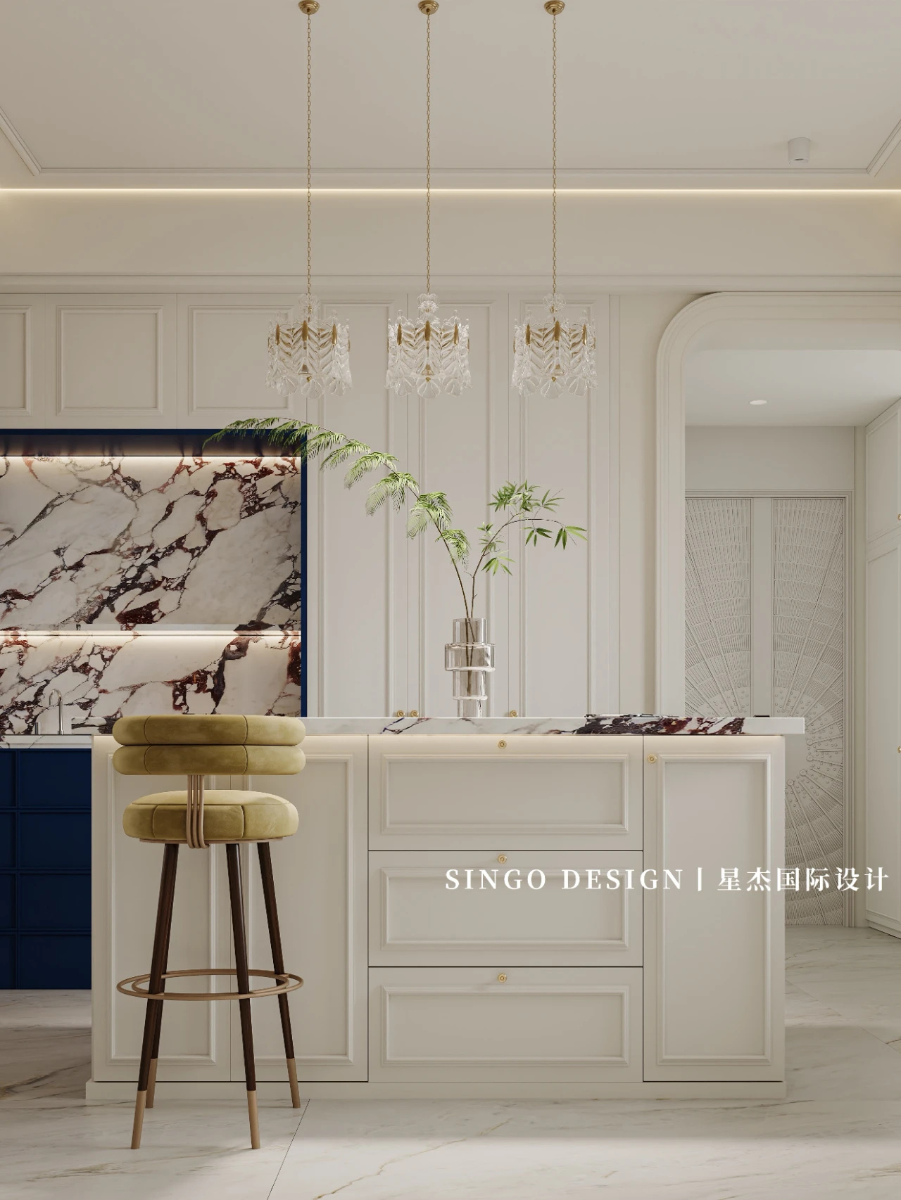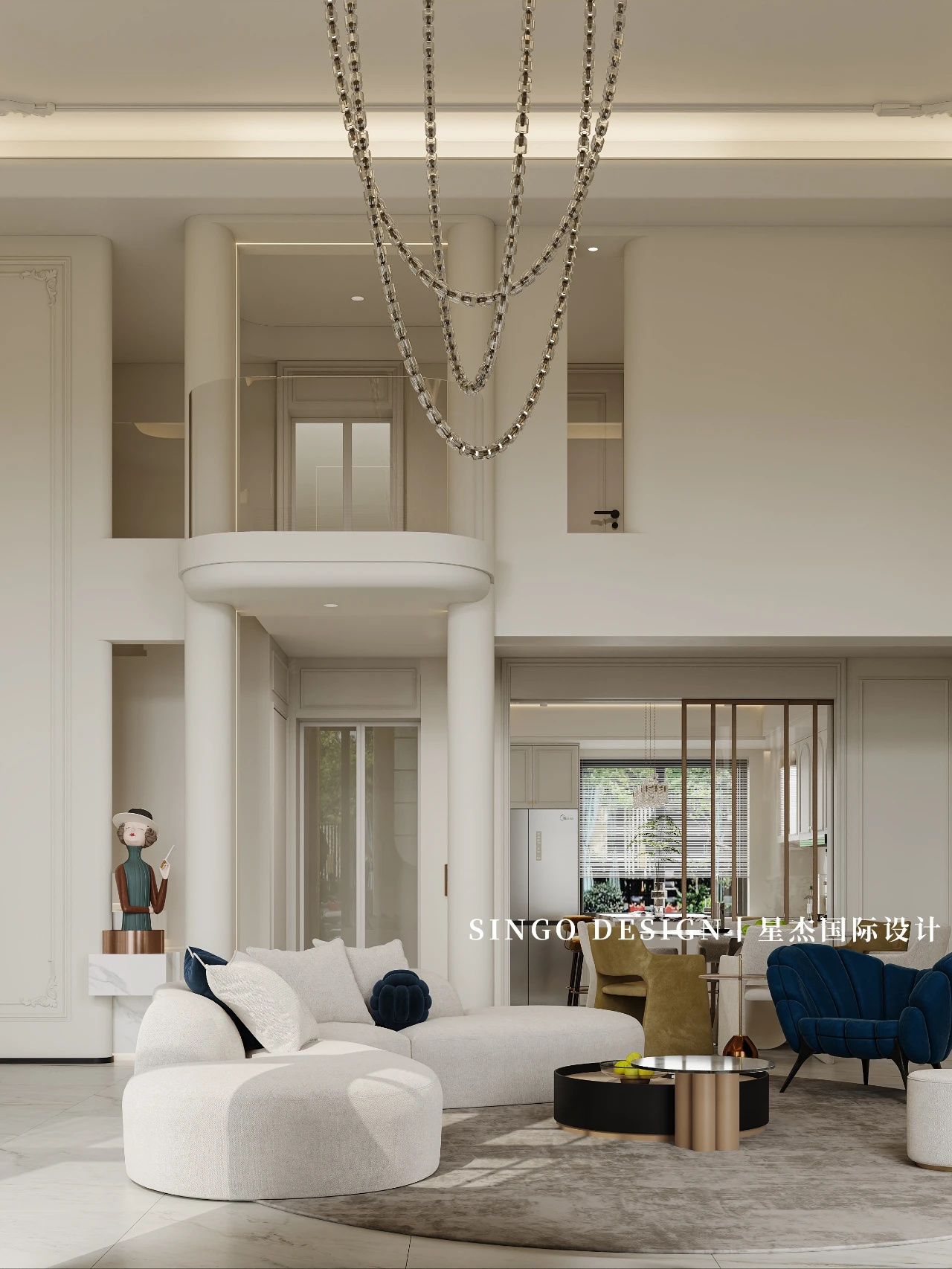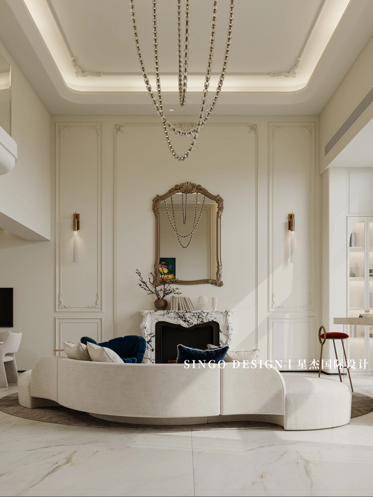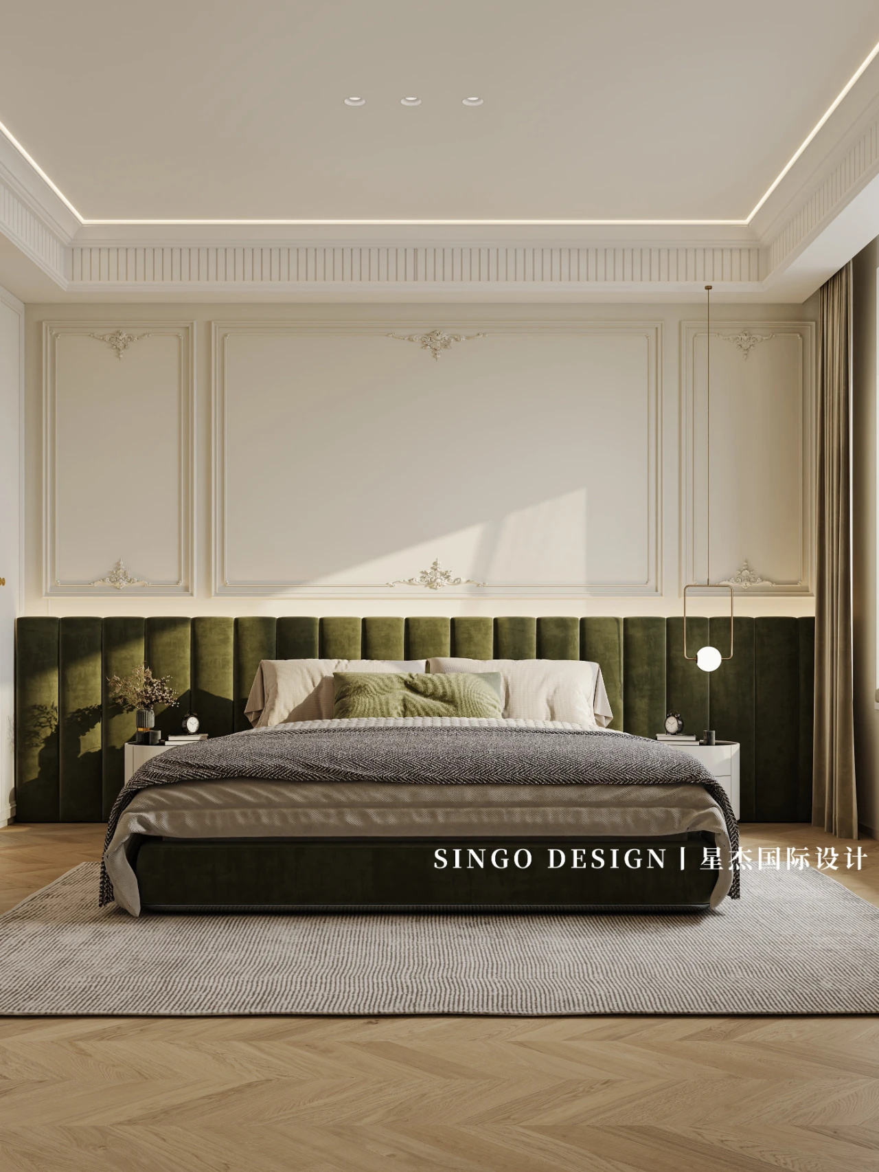 从挑空客厅的水晶链灯到卧室的墨绿绒面床头……每处都藏着 “创意 × 秩序” 的平衡—— 既满足男业主对视觉创意的要求,又通过法式线条、对称布局呼应女业主对秩序感的偏好。