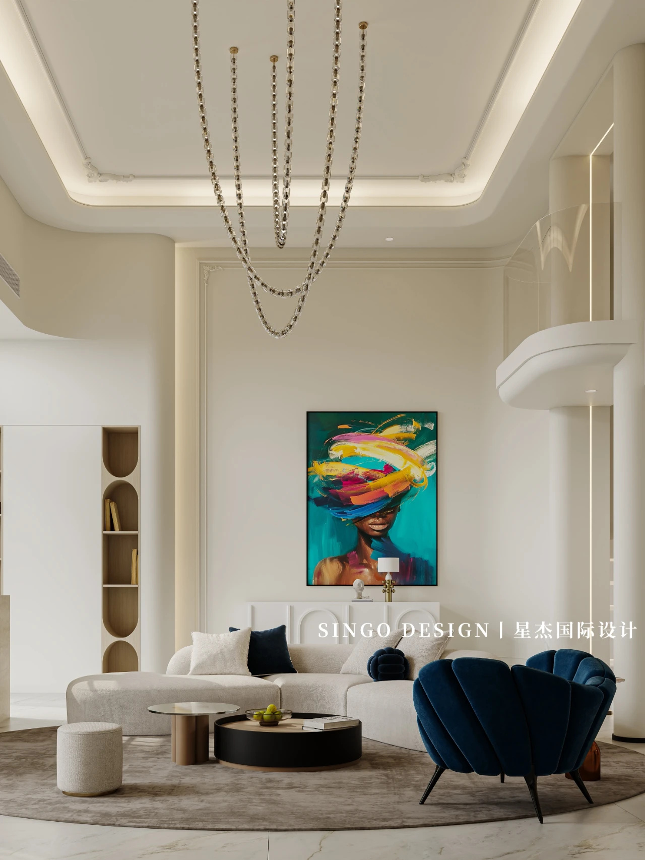 ✅以挑高客厅艺术挂画、羽毛灯等造型和色彩制造“冲突感”,契合业主审美需求。