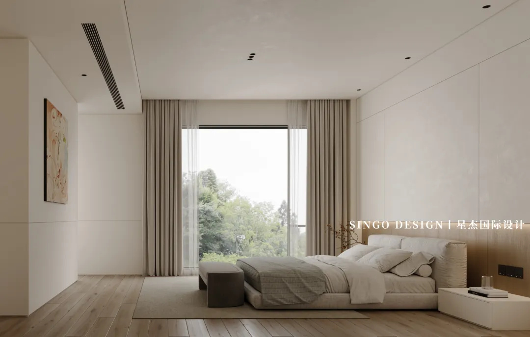 客厅延续极简美学,营造出放松交谈的氛围。女主人偶尔在这里静坐,电视的背景音和远处孩子的笑混在一起,成了最治愈的白噪音。